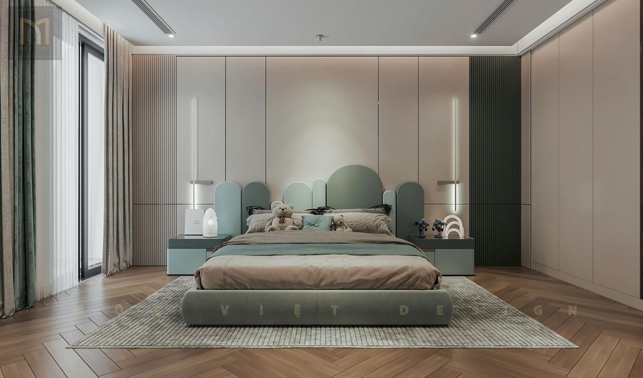 Phòng ngủ tân cổ điển mang vẻ đẹp nhẹ nhàng, lãng mạn. Từng chi tiết như đầu giường, rèm, tủ kệ… được xử lý tỉ mỉ, tạo không gian thư giãn hoàn hảo.