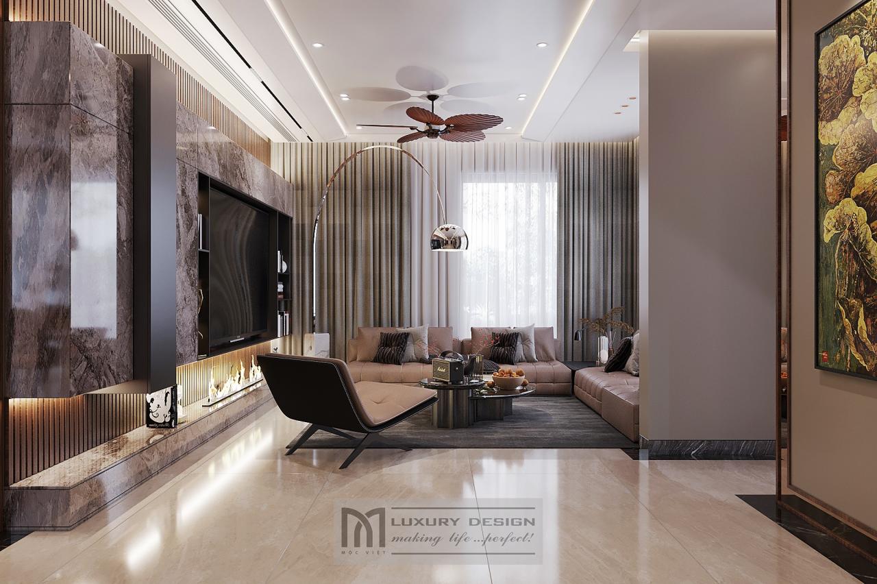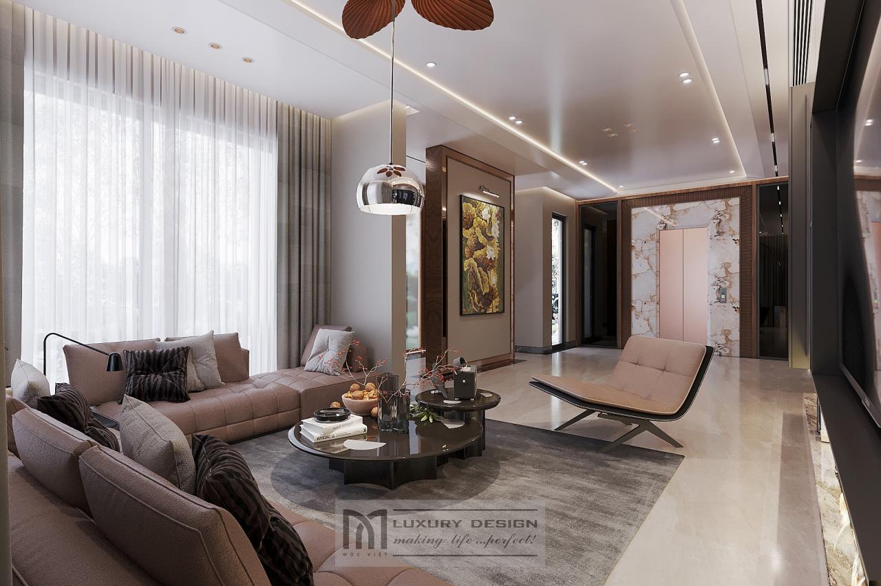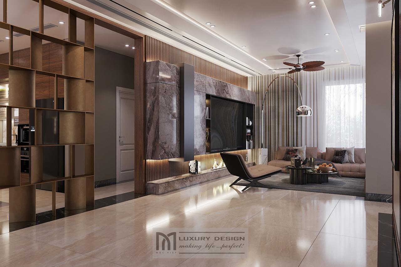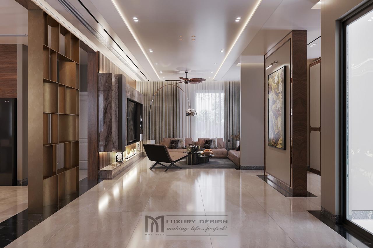 Trong hạng mục thiết kế nội thất phòng khách, Mộc Việt chọn tone màu nâu trầm phối cùng ánh sáng vàng ấm, kết hợp sofa da cao cấp, bàn trà gỗ óc chó nguyên khối và hệ tủ âm tường tinh giản.