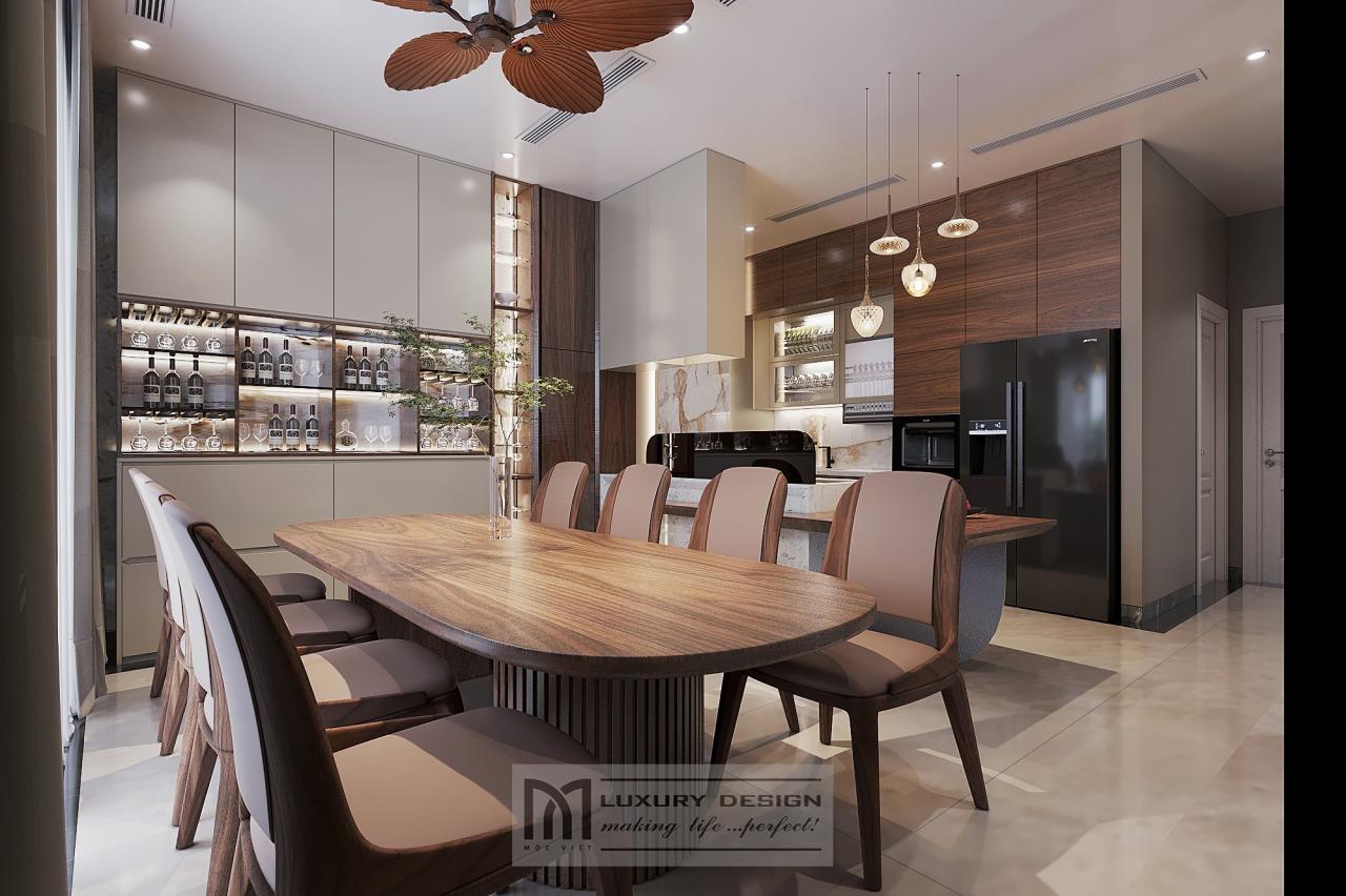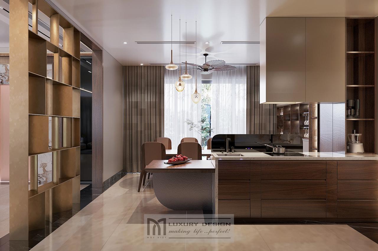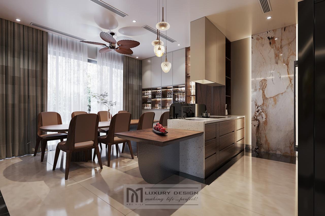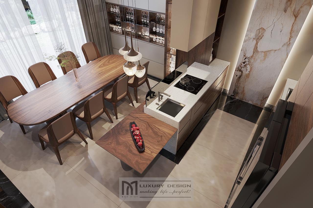 Ở phần thiết kế nội thất phòng bếp và thiết kế nội thất phòng ăn, Mộc Việt đặc biệt chú trọng tính công năng. Tủ bếp chữ L được thiết kế bằng gỗ óc chó kết hợp mặt đá tự nhiên, vừa thẩm mỹ vừa dễ vệ sinh.