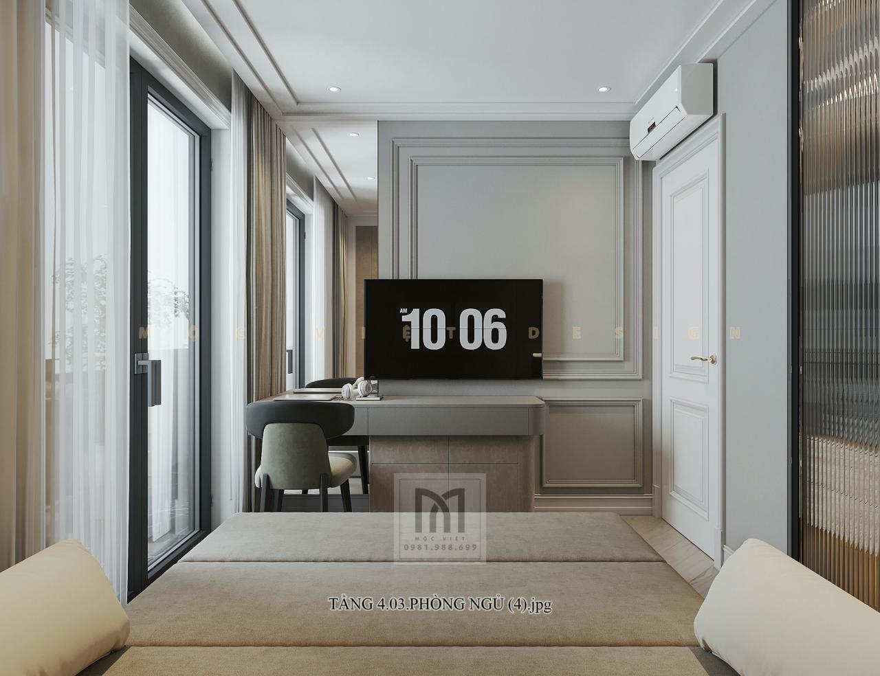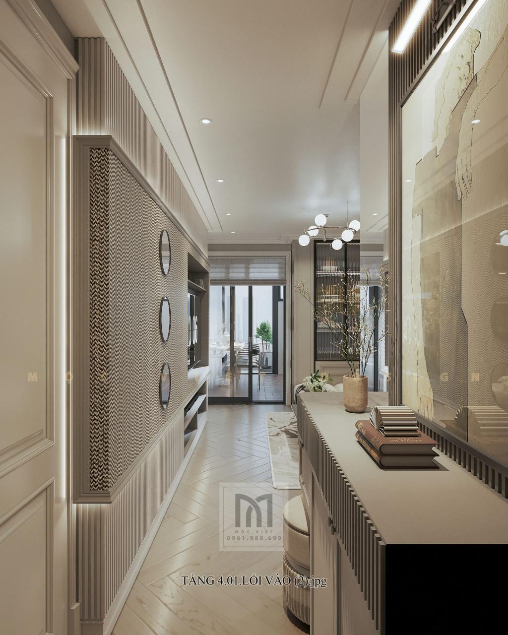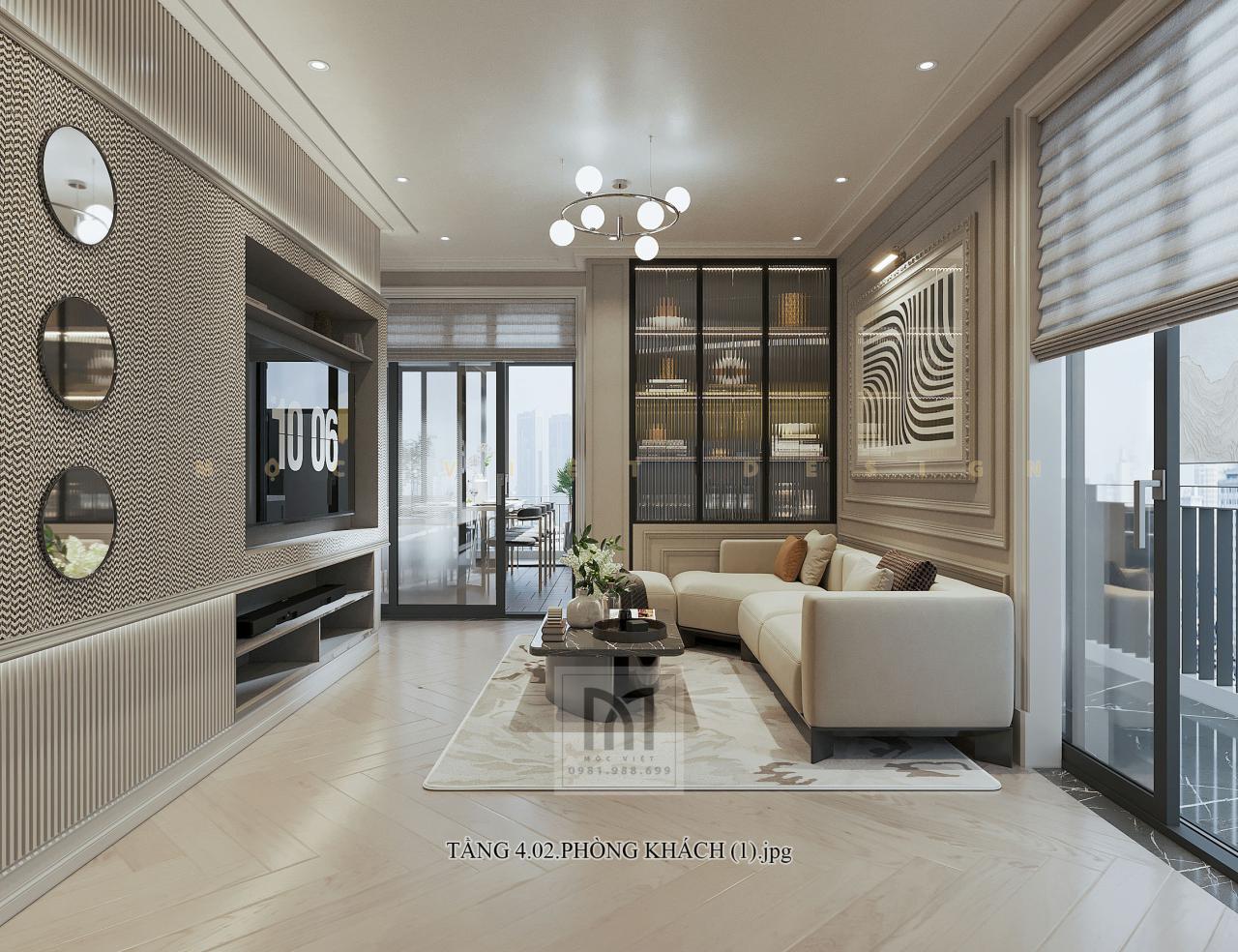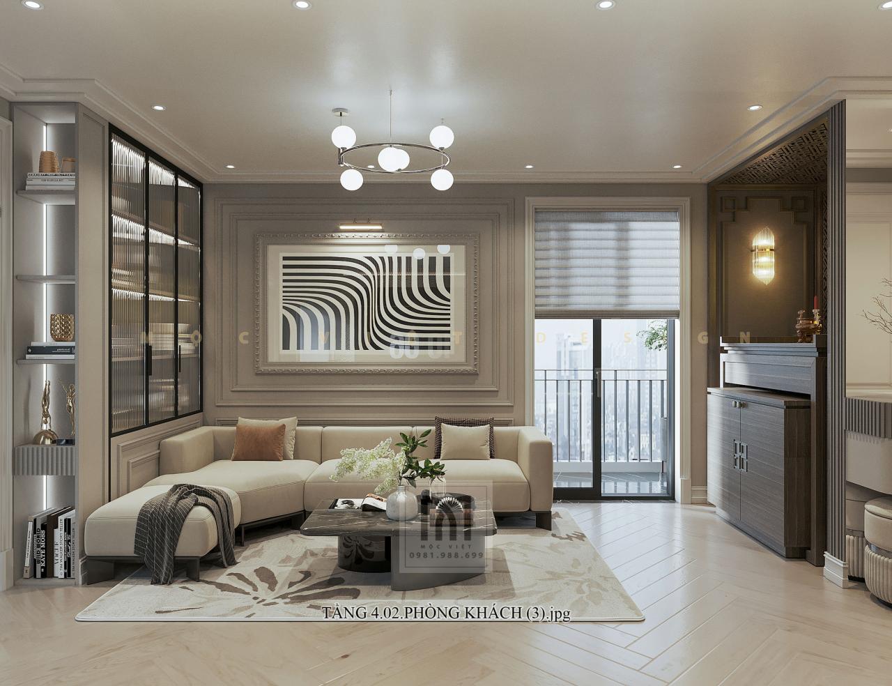Khác với lối thiết kế cổ điển cầu kỳ, phong cách tân cổ điển được Mộc Việt thể hiện trong dự án này mang vẻ đẹp nhẹ nhàng, thanh thoát. Các mảng tường được chia tỷ lệ hài hòa, nhấn nhá bằng phào chỉ tinh tế. Màu sắc chủ đạo là trắng kem, vàng ánh kim và nâu gỗ óc chó, kết hợp cùng ánh sáng ấm áp tạo nên tổng thể sang trọng nhưng vẫn gần gũi.