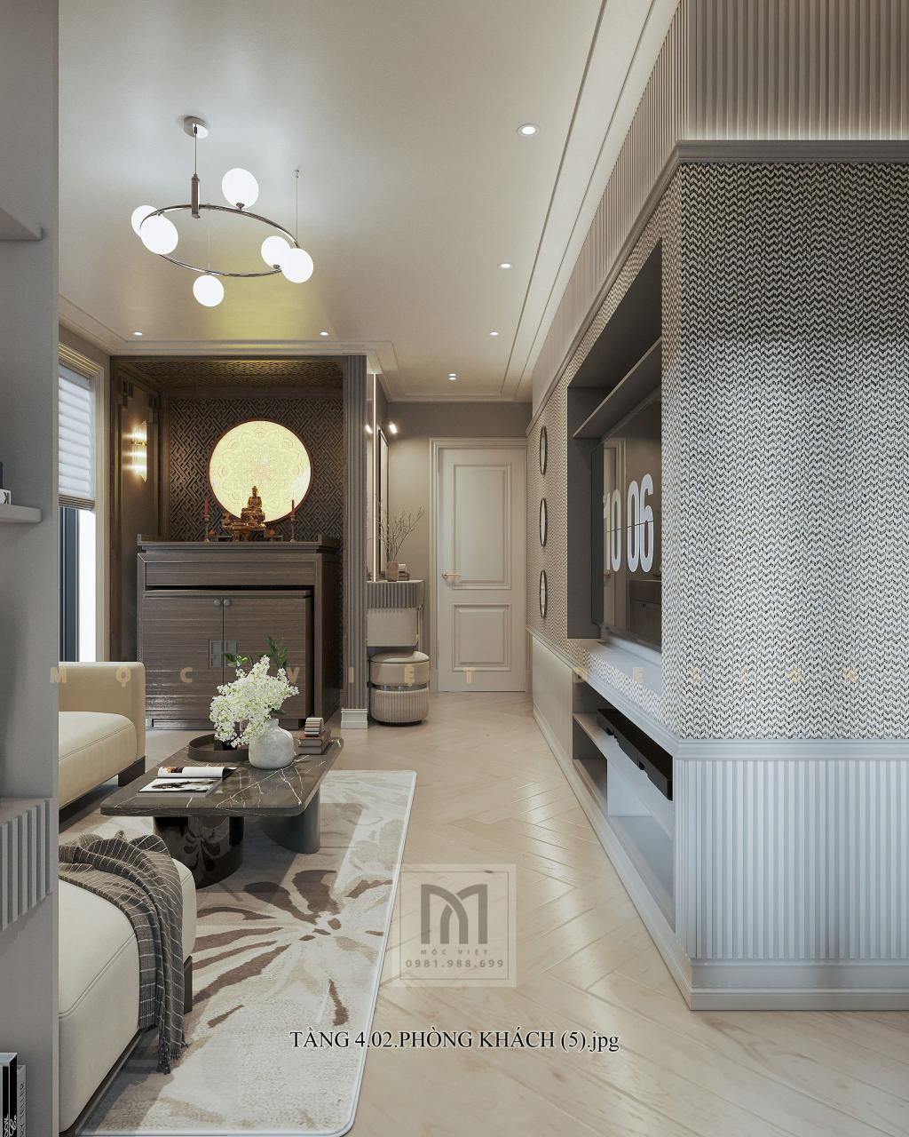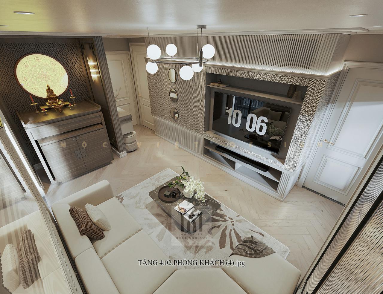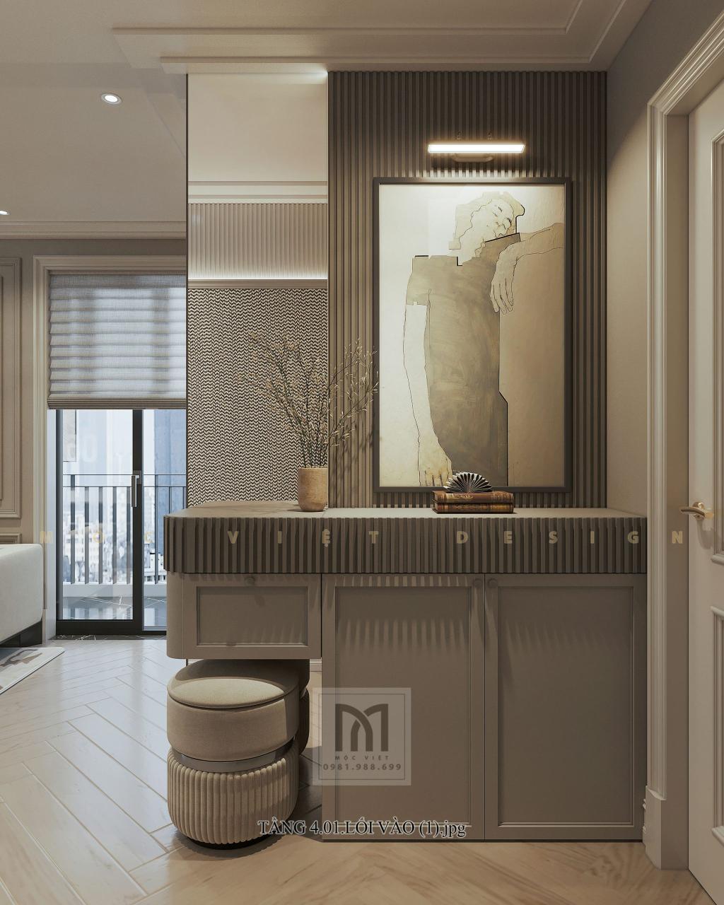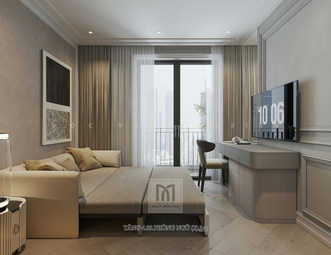 Khác với lối thiết kế cổ điển cầu kỳ, phong cách tân cổ điển được Mộc Việt thể hiện trong dự án này mang vẻ đẹp nhẹ nhàng, thanh thoát. Các mảng tường được chia tỷ lệ hài hòa, nhấn nhá bằng phào chỉ tinh tế. Màu sắc chủ đạo là trắng kem, vàng ánh kim và nâu gỗ óc chó, kết hợp cùng ánh sáng ấm áp tạo nên tổng thể sang trọng nhưng vẫn gần gũi.