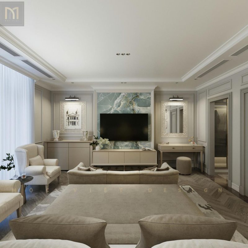 - Thiết kế nội thất phòng khách mang phong cách sang trọng, màu sắc trang nhã, vật liệu cao cấp.